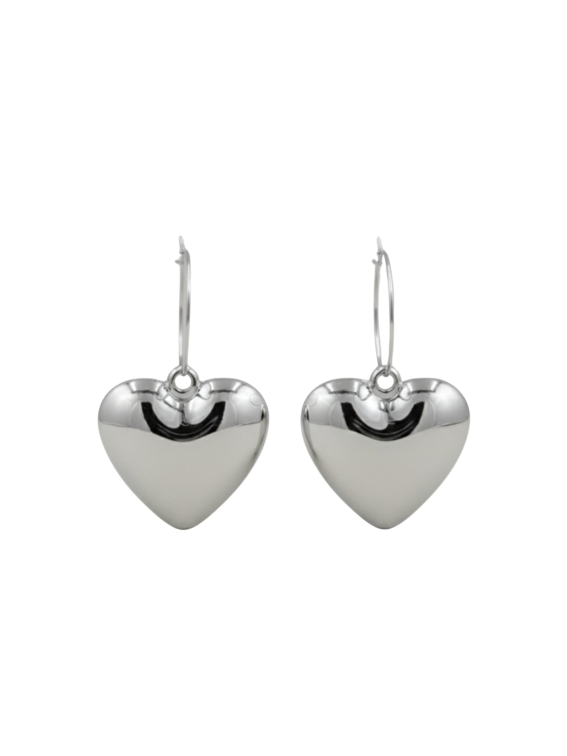זוג עגילי חישוק דקים בשילוב לב מנופח עשויים פליז מצופה רודיום.