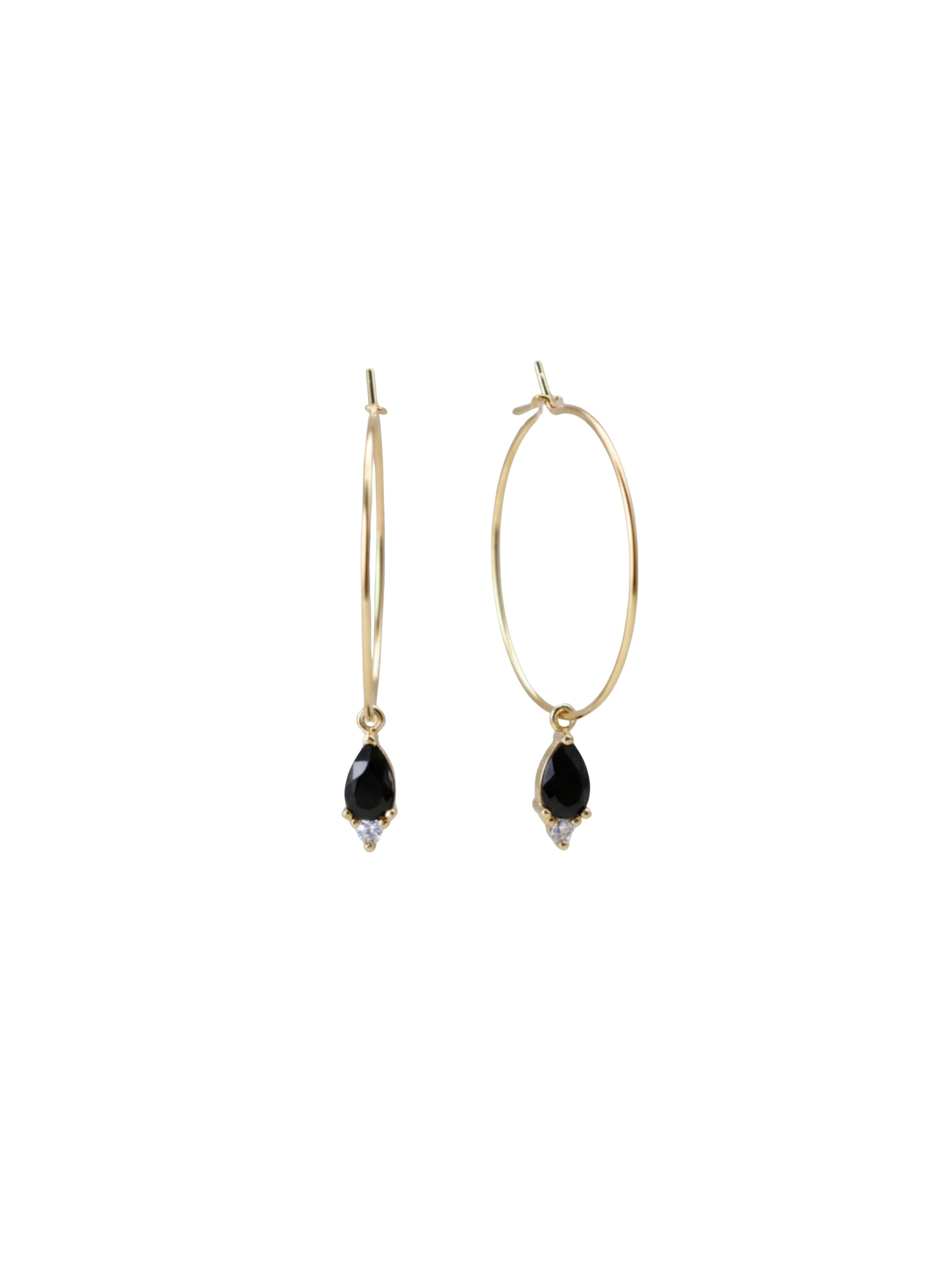 זוג עגילי חישוק עשויים פליז מצופה זהב 16 קאראט בשילוב צ'ארמ קטנטן משובץ זירקונים בשחור ושקוף.