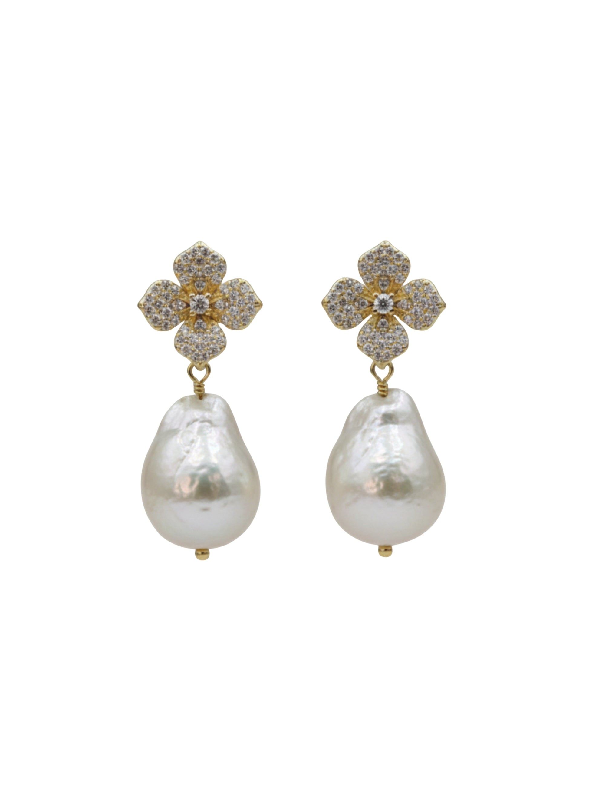 זוג עגילי פרחים עשויים פליז מצופה זהב 16 קאראט משובצים זירקונים קטנטנים בשילוב פנינת מים מתוקים.