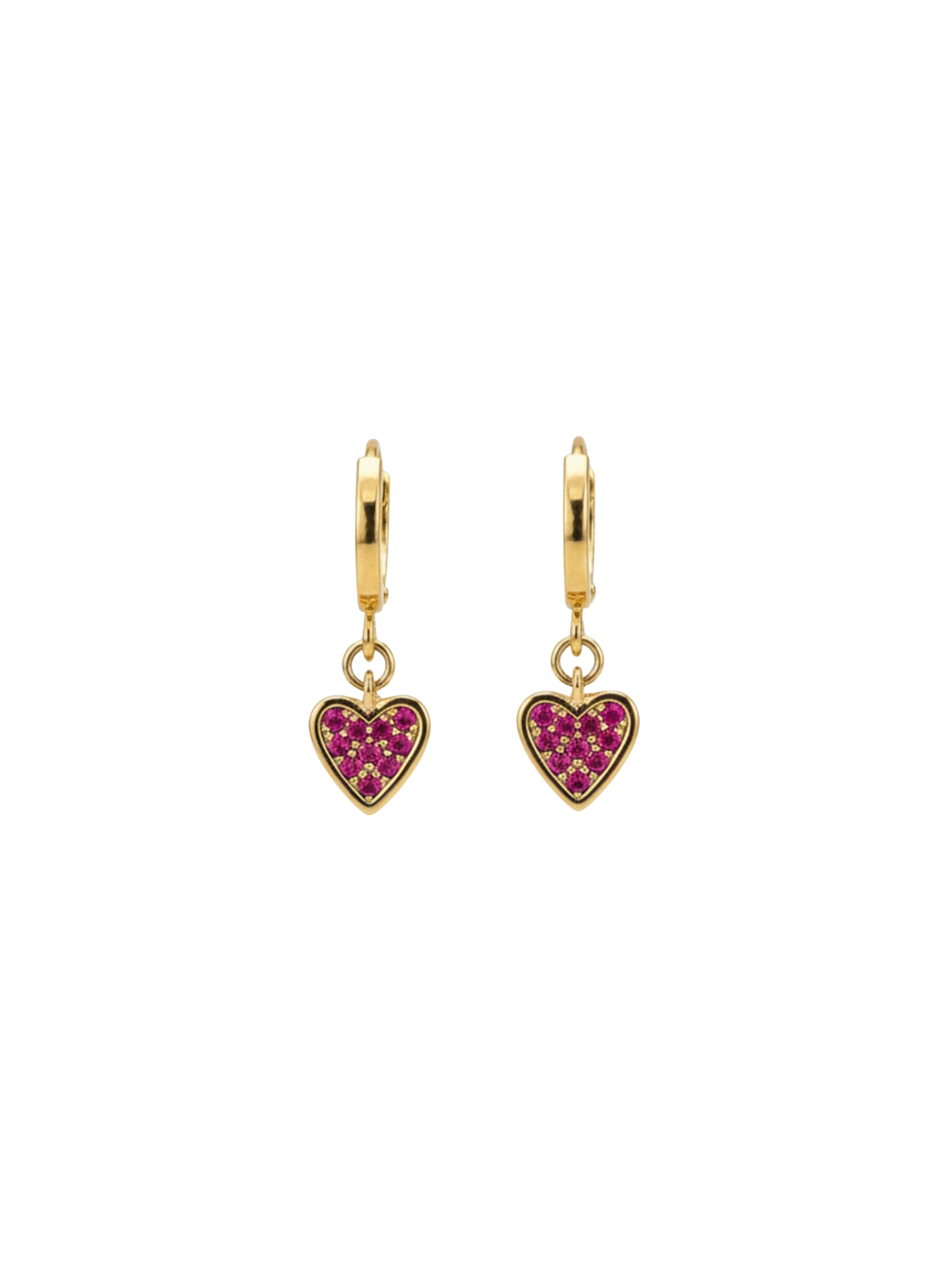 עגילי חישוק קטנטנים עשויים פליז מצופה זהב 16K בשילוב צ'ארמ לב משובץ זירקונים ורודים.